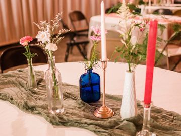 In addition to tables and chairs for up to 150 guests, we also have ivory linens, burlap and lace table runners, dinnerware, decorations, vases, candles and so much more. All you need to bring is your food, drinks, flowers and a play list.